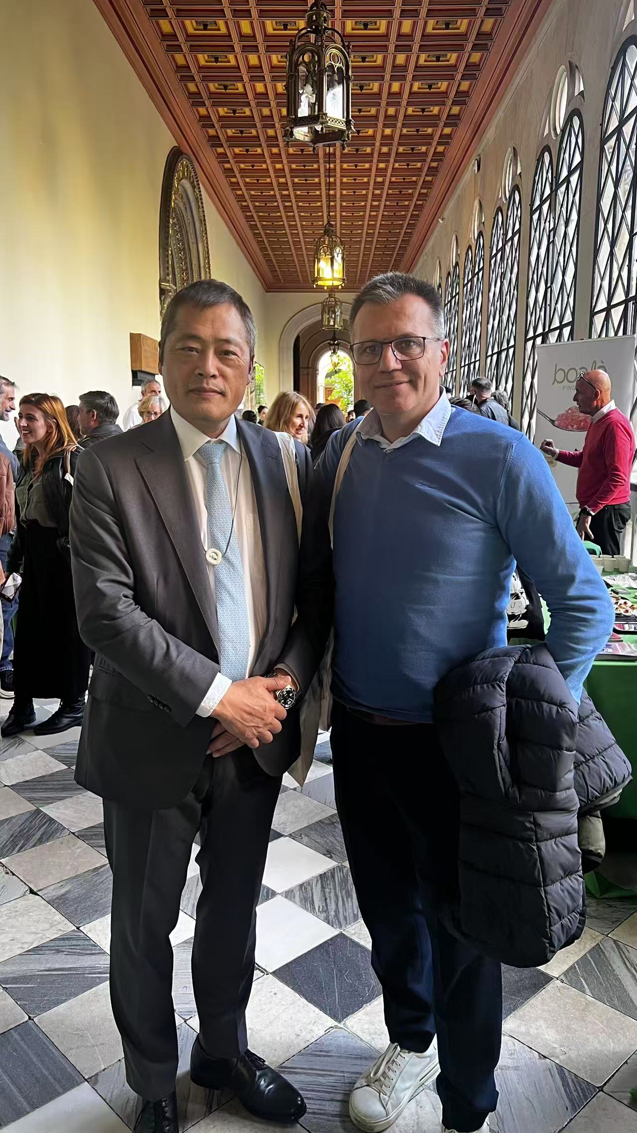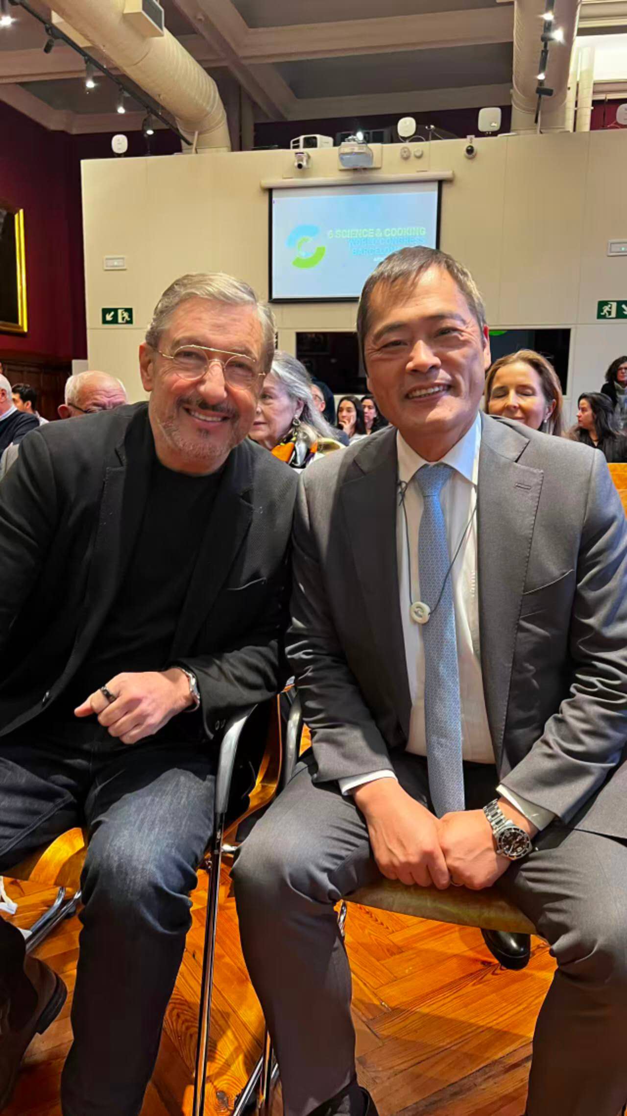上图为蒙福食品董事长庄鹤举先生和“全球第一餐厅 Disfrutar”主厨Oriol Castro合影